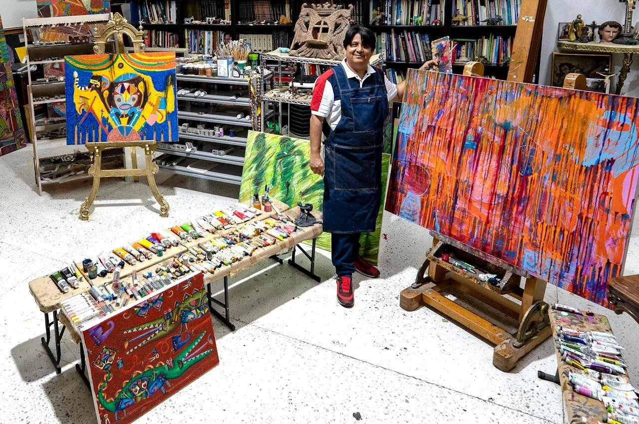 Fernando Andriacci's artistic universe is a celebration of joy, color, and human connection, deeply rooted in his Oaxacan heritage. His work embraces the power of art to evoke emotions, particularly the idea of happiness, which he conveys through fantastical characters, animals, and bold visual textures. His paintings and sculptures, rich with intricate drawings that transition between figuration and abstraction, create a world where emotions take shape through vibrant compositions.